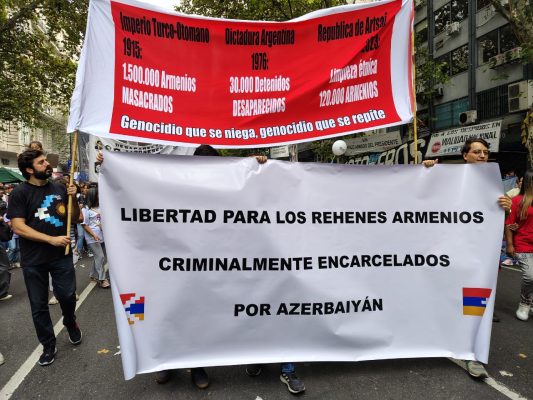 Այս տարուայ Մարտ 24-ի ցոյցերուն մասնակցած համայնքային այդ կազմակերպութիւններու պարզած պաստառներուն վրայ տեղ գտած էին նաեւ Պաքուի մէջ դատուող հայ գերիներու ազատ արձակման ու բռնի տեղահանուած արցախահայութեան վերադարձի պահանջները: Ցեղասպանութեան մէկուկէս միլիոն զոհերու, 120 հազար բռնի տեղահանուած արցախահայութեան յիշատակումը տեղադրուած էր զինուորական բռնատիրութեան ցեղասպանութեան 30 հազար անհետացածներու թիւին կողքին: