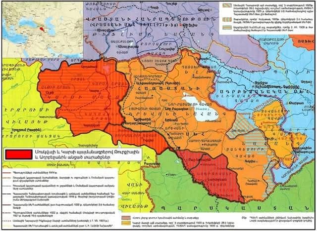 Յ․Գ․ 2։ Քարտէզում կարմիրով նշուած են այն տարածքները, որոնք մեր «եղբայր» ռուսների ձեռամբ, Մոսկուայի եւ Կարսի պայմանագրերով անցան Թուրքիային։