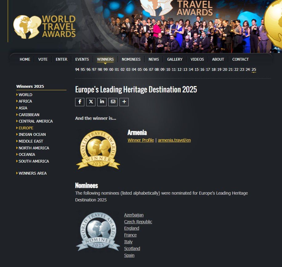 2025 թուականին Հայաստանը ճանաչուել է Եւրոպայի առաջատար ժառանգութեան վայր հեղինակաւոր World Travel Awards մրցանակաբաշխութեան կողմից, որը յաճախ անուանում են «զբօսաշրջութեան Օսքար»։